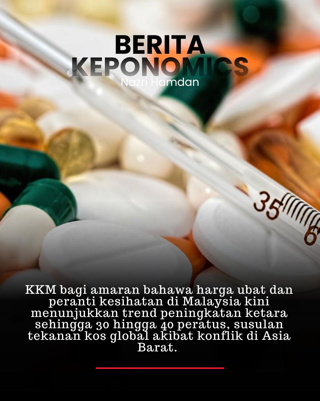Kementerian Kesihatan Malaysia (KKM) telah mengeluarkan amaran mengenai kenaikan harga ubat dan peranti kesihatan yang ketara, yang kini meningkat antara 30 hingga 40 peratus. Kenaikan ini disebabkan oleh tekanan kos global yang dipengaruhi oleh konflik di Asia Barat.