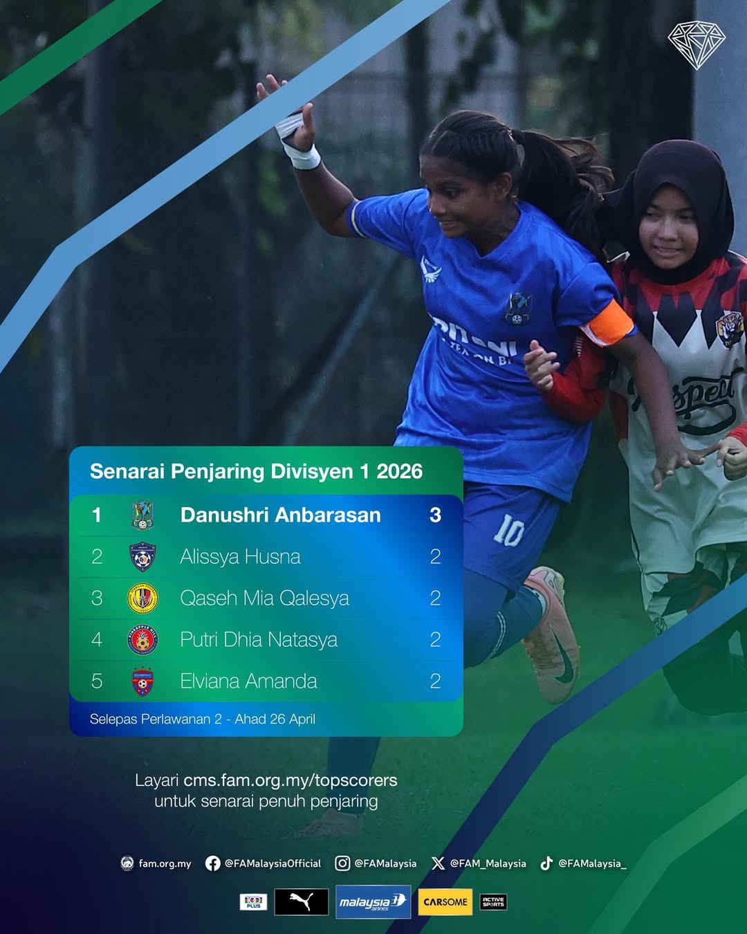 Kejayaan A. Danushri yang meraih hatrik dalam pertembungan menentang Putrajaya Tigress semasa debutnya bersama Penang Indian FC di Liga Puteri Divisyen 1 2026 telah mengangkatnya ke tempat teratas carta penjaring terbanyak. Pemain berusia 15 tahun ini kini mendahului senarai pemain yang menjaringkan gol!