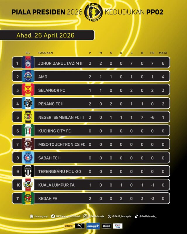 Home Sukan Carta Kedudukan Piala Presiden 2026: Analisis dan Trend Terkini Sukan Carta Kedudukan Piala Presiden 2026: Analisis dan Trend Terkini By admin - April 27, 2026 42 0 FacebookTwitterPinterestWhatsApp Carta Kedudukan Piala Presiden 2026 ▶️ Setelah tamat Hari Perlawanan 2 pada Sabtu, 25 April 2026 & Ahad, 26 April 2026 FAM #HarimauMalaya #PialaPresiden2026 Source