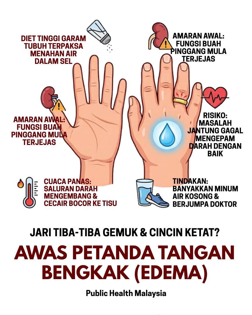 Bangun pagi dan mendapati cincin tidak dapat ditanggalkan, jam tangan terasa ketat di pergelangan, serta jari-jemari kelihatan lebih besar? Ramai yang panik dan terus membandingkan berat badan dengan harapan lemak tidak bertambah semalaman. Tenangkan fikiran. Jika anda mengalami pembengkakan dan ketegangan pada tangan, ia biasanya bukan kerana lemak, tetapi satu keadaan yang dikenali sebagai Edema. Edema terjadi akibat pengumpulan cecair berlebihan dalam tisu badan.