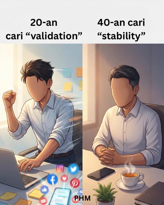 Kalau sebelumnya di usia 20-an kita aktif bekerja, berani bersuara, dan rajin berkongsi pelbagai perkara, masuk ke usia 40-an kita beralih ke keinginan untuk hidup lebih tenang dan bersifat peribadi. Ini bukan sesuatu yang aneh. Ini adalah perubahan yang biasa.