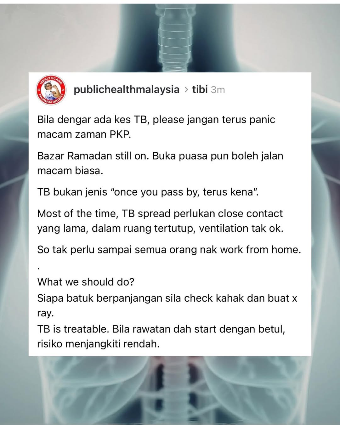 Sekiranya anda mengalami batuk lebih daripada dua minggu, demam pada waktu petang, kehilangan berat badan, peluh malam, atau cepat merasa penat, jangan bertangguh. Segeralah ke klinik untuk mendapatkan pemeriksaan dan X-ray. Tibi boleh diubati, dan dengan rawatan yang tepat, risiko penularannya akan berkurangan dengan ketara.