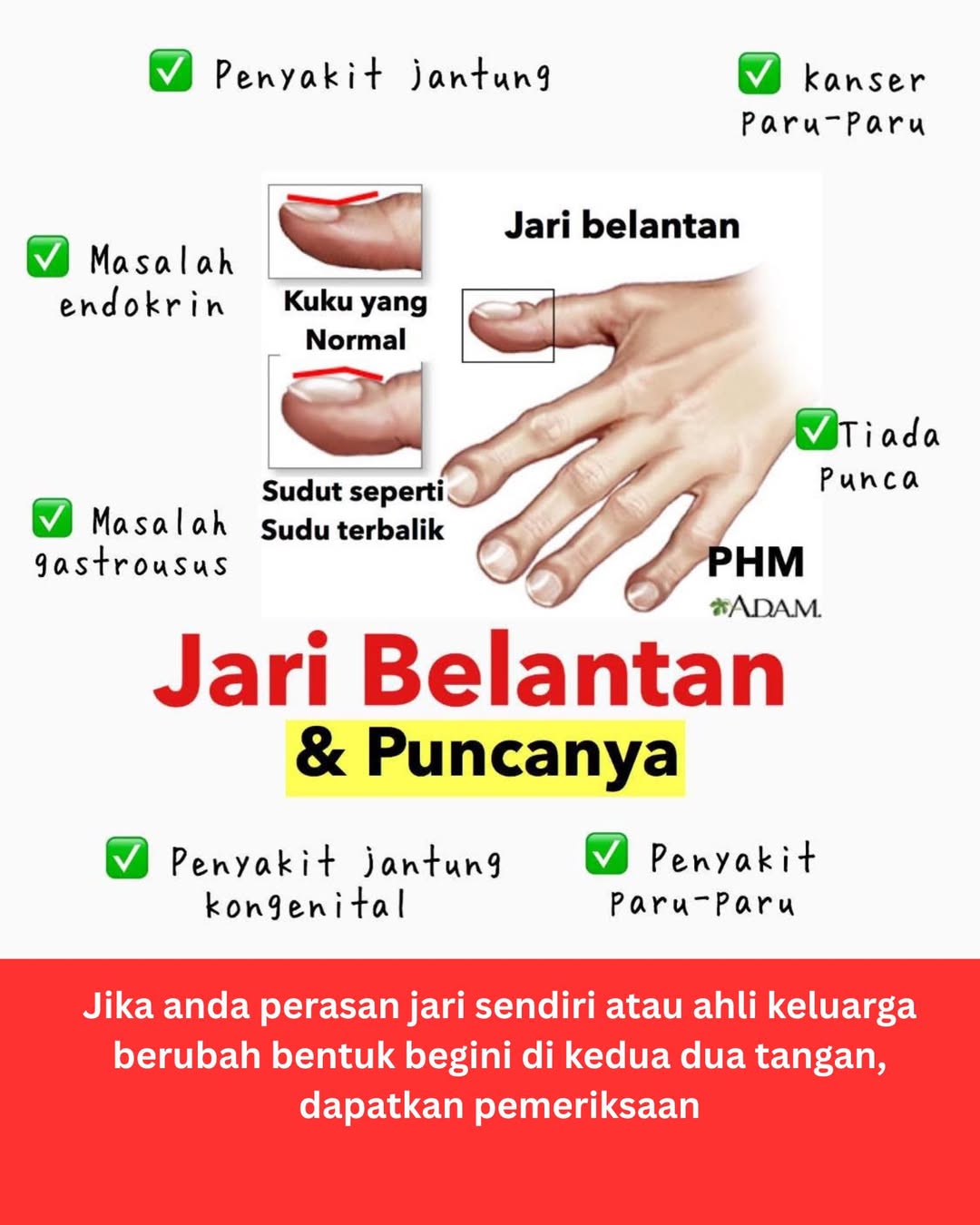 Jika anda melihat perubahan pada jari anda atau ahli keluarga di kedua-dua belah tangan, terutama jika terdapat gejala seperti batuk berkepanjangan, sesak nafas, sakit dada, penurunan berat badan, atau cepat penat, jangan diabaikan.