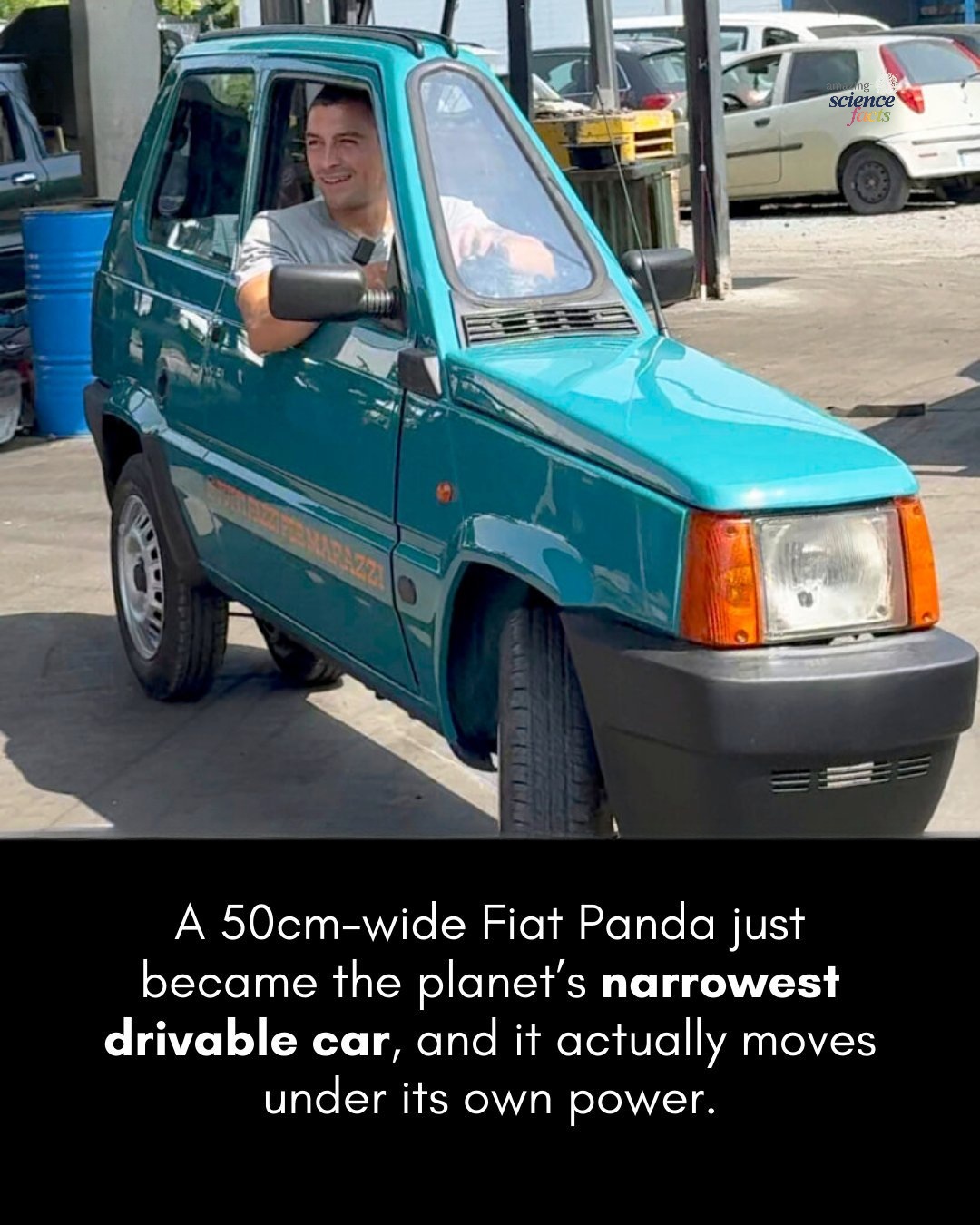 Sebuah Fiat Panda yang telah dimodifikasi secara berat telah diubah menjadi apa yang digambarkan oleh pelbagai sumber sebagai kereta yang paling sempit di dunia, dengan lebar kira-kira 50 sentimeter. Kenderaan ini kelihatan hampir dua dimensi dari sudut tertentu, namun ia masih mampu bergerak, membelok, dan berhenti seperti sebuah kereta berfungsi.