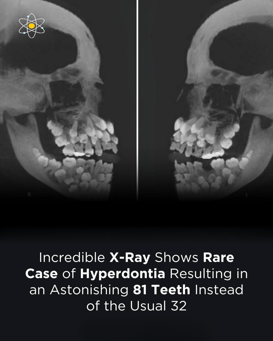 Satu kes yang ditunjukkan dalam X-ray mengungkapkan contoh ekstrem hyperdontia, di mana individu tersebut mempunyai jumlah keseluruhan 81 gigi. Ini termasuk gigi dewasa biasa serta sejumlah besar gigi tambahan yang tidak tumbuh dengan rapat di dalam rahang.