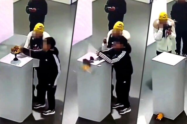 Rakaman CCTV menunjukkan ibunya yang sibuk mengambil gambar sementara anaknya sedang mengelap permukaan kotak pelindung agar gambar kelihatan lebih cantik. Malangnya, bekas pameran itu tidak dipasang dengan kukuh dan telah jatuh.