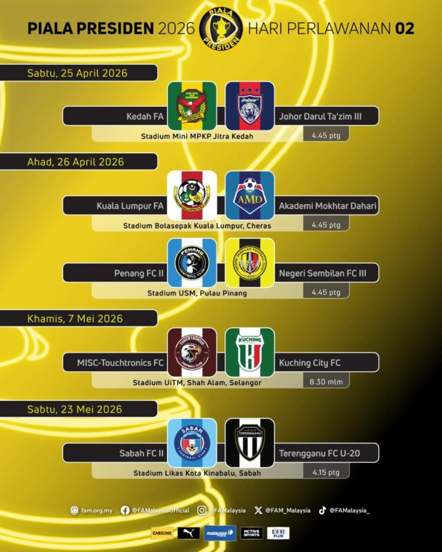 Home Sukan Jadual Perlawanan Piala Presiden 2026: Siapa Juara Tahun Ini? Sukan Jadual Perlawanan Piala Presiden 2026: Siapa Juara Tahun Ini? By admin - April 24, 2026 11 0 FacebookTwitterPinterestWhatsApp Jadual Pertandingan Piala Presiden 2026 ๐๏ธ Tarikh: 25 dan 26 April 2026 serta 7 dan 23 Mei 2026 FAM #HarimauMalaya #PialaPresiden2026 Source