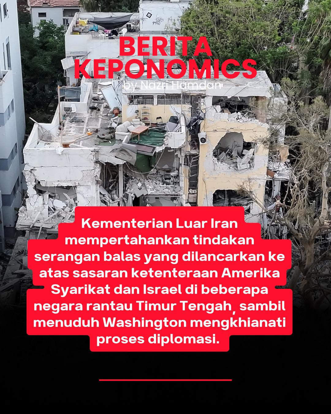 Kementerian Luar Iran membela tindakan serangan balas yang dilakukan terhadap sasaran ketenteraan Amerika Syarikat dan Israel di beberapa negara di kawasan itu, sambil menuduh Washington telah mengkhianati proses diplomatik.