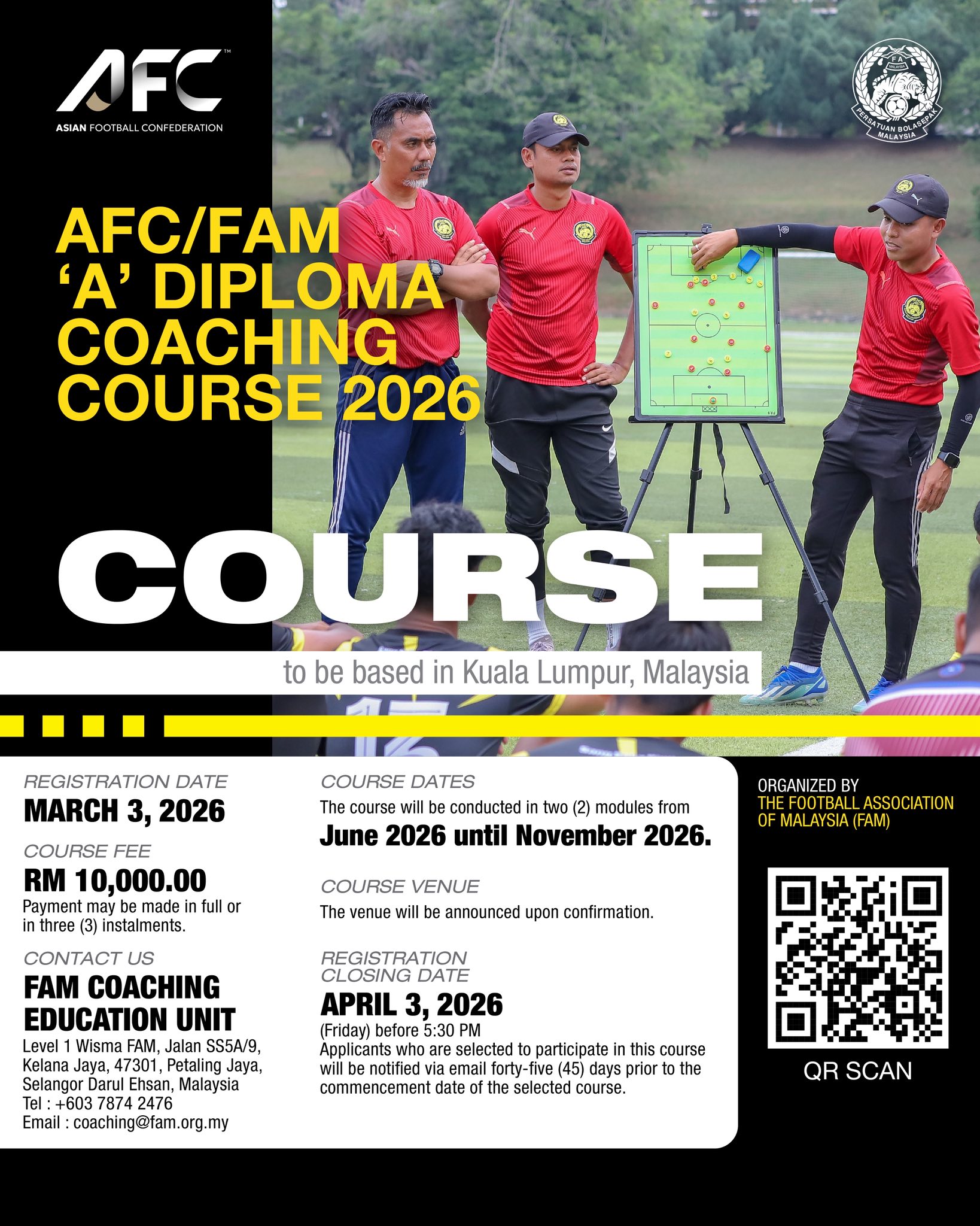 Football Association of Malaysia (FAM) will organize a series of football coaching courses for 2026 under the AFC/FAM program. The available courses are: