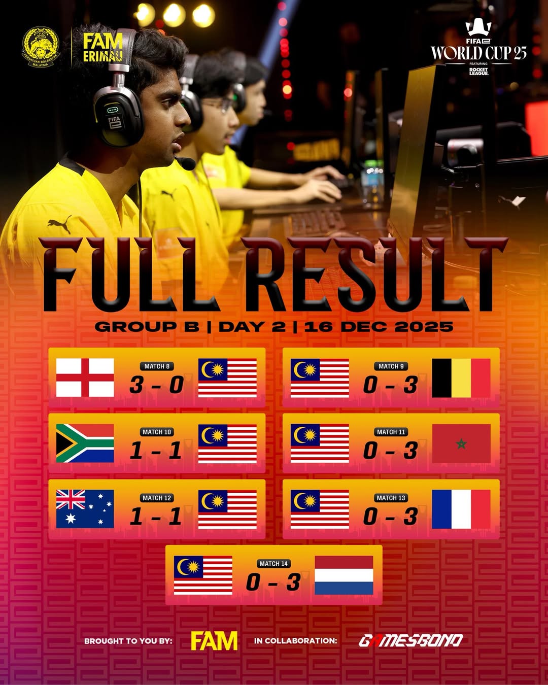 Pasukan FAM eRimau telah menamatkan cabaran di FIFAe World Cup 2025 Ft. Rocket League pada peringkat kumpulan setelah meraih 2 keputusan seri dan 5 kekalahan semasa Hari Perlawanan 2.