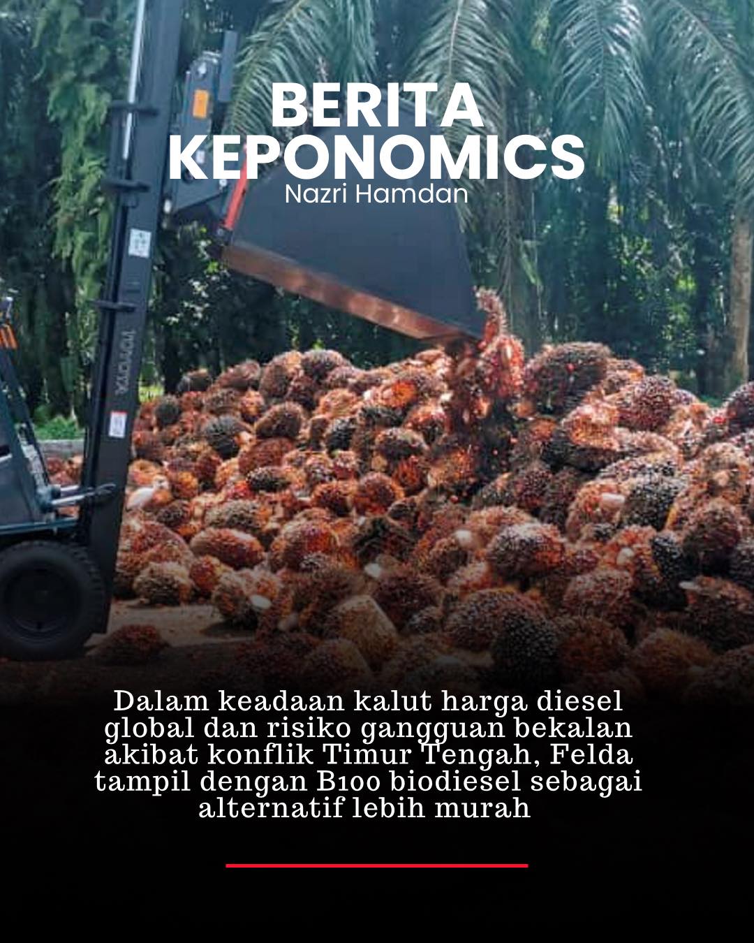 Dalam situasi harga diesel global yang tidak stabil akibat ketegangan geopolitik di Asia Barat, Felda mengambil langkah proaktif dengan mempromosikan penggunaan B100 biodiesel sebagai solusi bahan api yang lebih berdaya saing dan berkelanjutan.