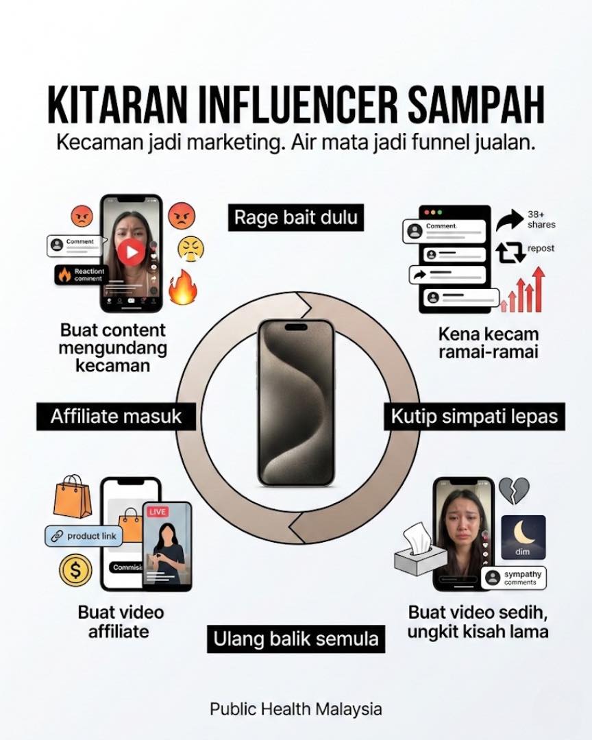 Itulah sebabnya sesetengah influencer tidak merasa takut dengan kritikan. Kecaman dianggap sebagai alat pemasaran, air mata sebagai rebranding, dan simpati sebagai cara penjualan.