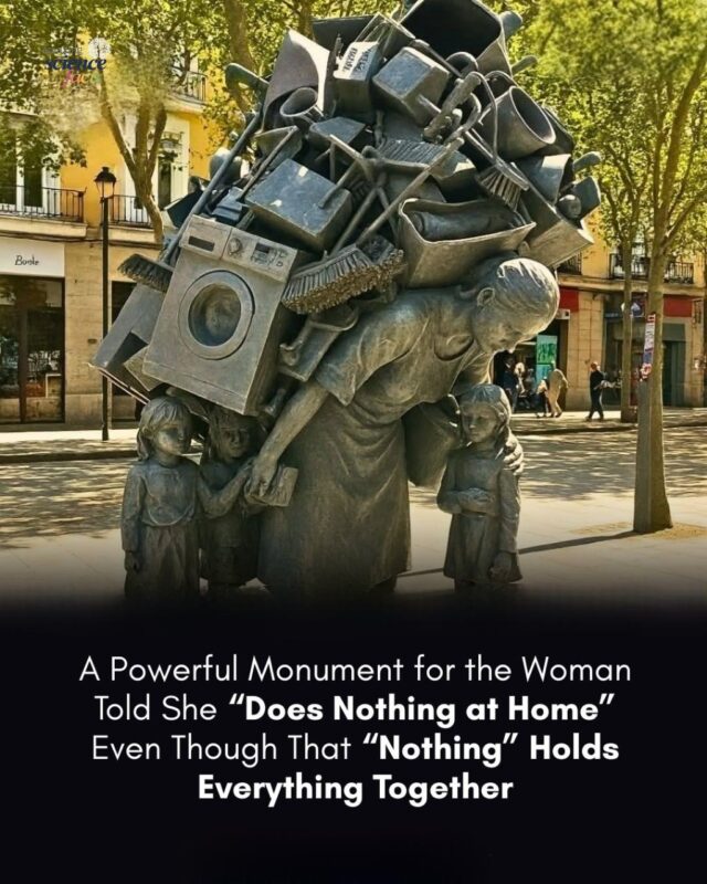 Patung ini menggambarkan seorang wanita yang dibebani oleh tumpukan besar barangan rumah tangga harian, seperti mesin basuh, penyapu, kelengkapan bayi, dan beg belanja. Ia mencerminkan beban tidak terlihat yang ditanggung oleh kerja domestik tanpa bayaran, yang selalunya jatuh kepada wanita.