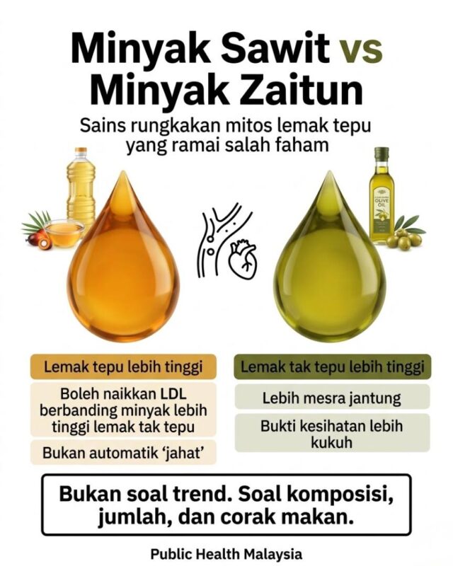 Jika ditanya, mana yang lebih baik untuk kesihatan jantung—minyak sawit atau minyak zaitun? Jawapannya adalah minyak zaitun. Tetapi jika ditanya adakah minyak sawit perlu dianggap sebagai musuh utama, jawapannya tidak begitu mudah.