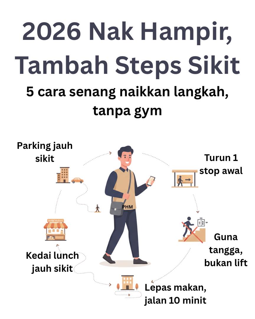 Letakkan kereta di tempat yang lebih jauh. Nikmati makan tengah hari di kedai yang agak jauh. Mungkin perkara ini kecil, tetapi jika dilakukan secara konsisten, jumlah langkah harian akan meningkat tanpa kita sedar.