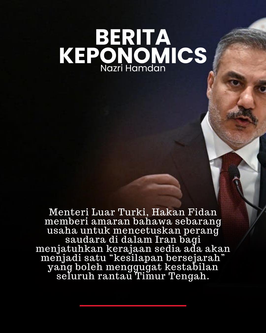 Menteri Luar Turki, Hakan Fidan, mengeluarkan peringatan keras bahawa sebarang tindakan untuk mencetuskan perang saudara di Iran bagi menggantikan kerajaan yang ada akan dianggap sebagai satu “kesilapan bersejarah” yang berisiko besar terhadap kestabilan seluruh Timur Tengah.