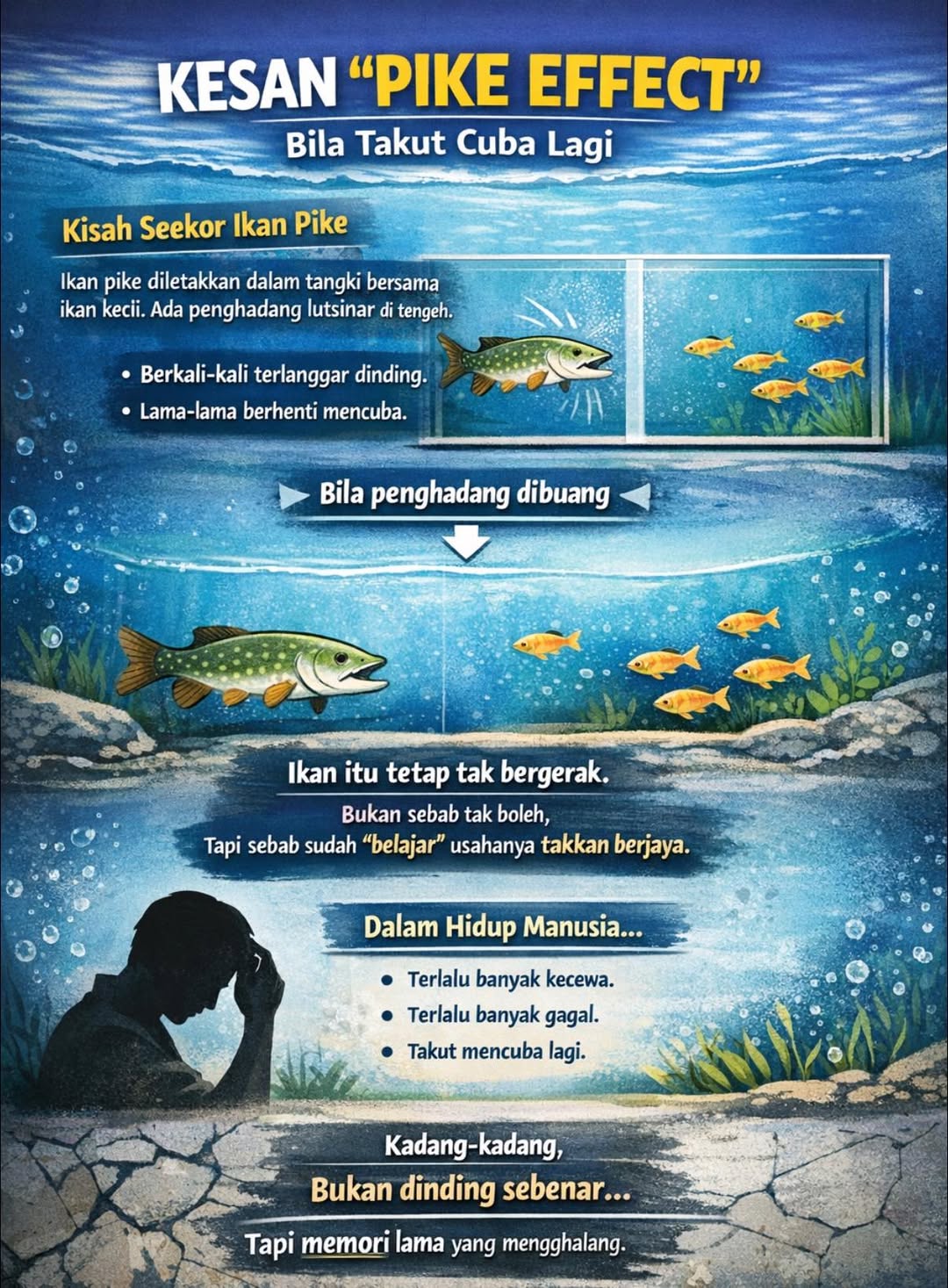 Lebih menyedihkan, walaupun penghadang tersebut dibuang, ikan itu tidak lagi berenang ke arah mangsanya. Bukan kerana ia tidak mampu, tetapi kerana ia telah “belajar” bahawa usahanya tidak akan berhasil. Kisah ini dikenali sebagai efeks Pike, atau dalam istilah psikologi yang lebih tepat, learned helplessness.