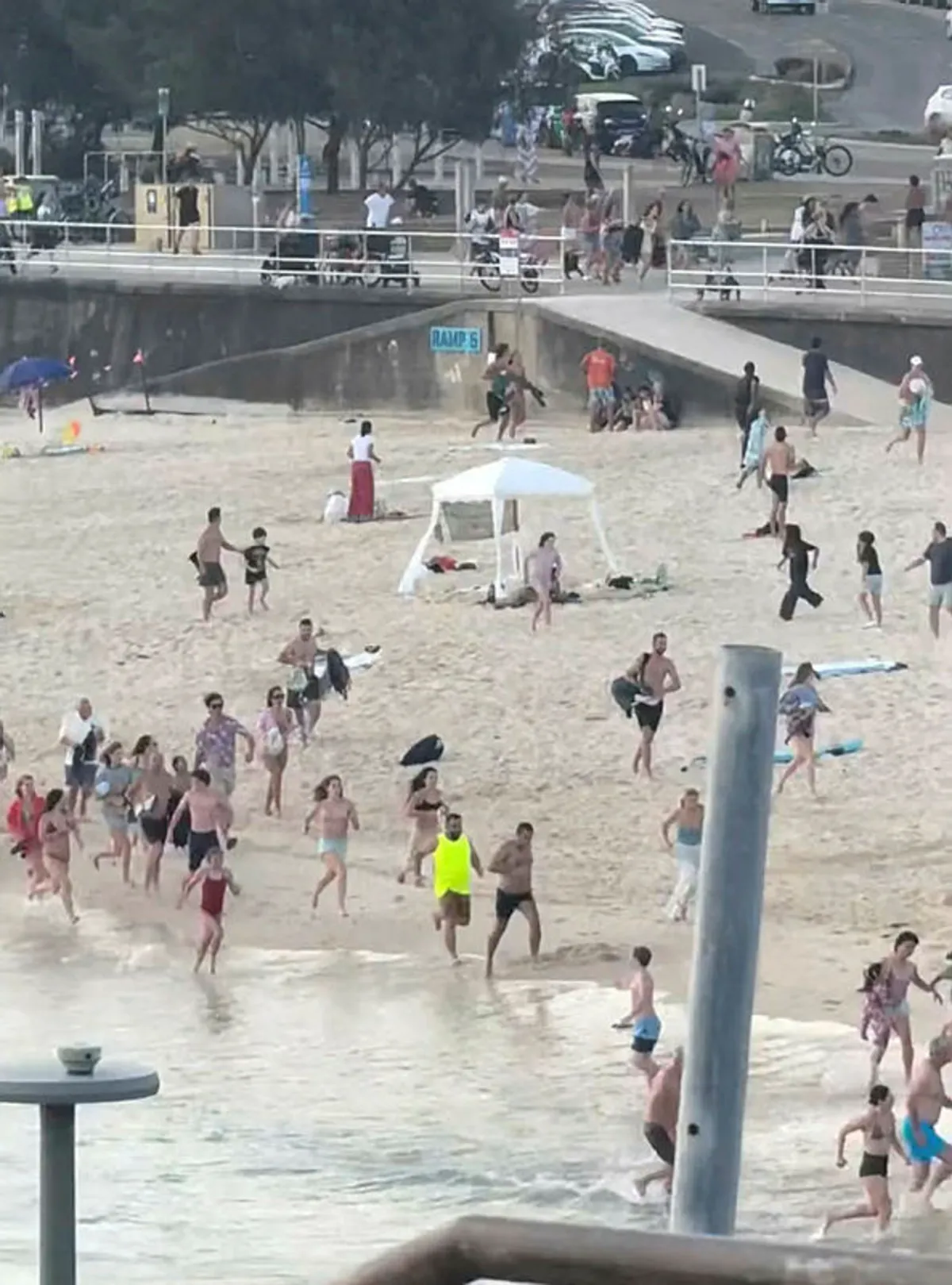 Rakaman dari kamera luncur menunjukkan puluhan orang berlari menyeberangi pasir Bondi untuk melarikan diri dari tembakan.
