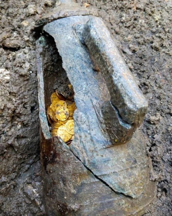 Pada tahun 2018, sebuah narasi sejarah menarik ditemui di Como, Itali Utara, apabila sejenis bekas gangsa yang menampung hampir 300 syiling emas Romawi dari akhir abad ke-4 M digali. Jug ini, walaupun telah retak akibat kesan waktu, kekal teguh dalam bentuknya, menyimpan kekayaan empayar yang tersembunyi selama berabad-abad, melalui pelbagai zaman kejatuhan dan kelahiran semula.