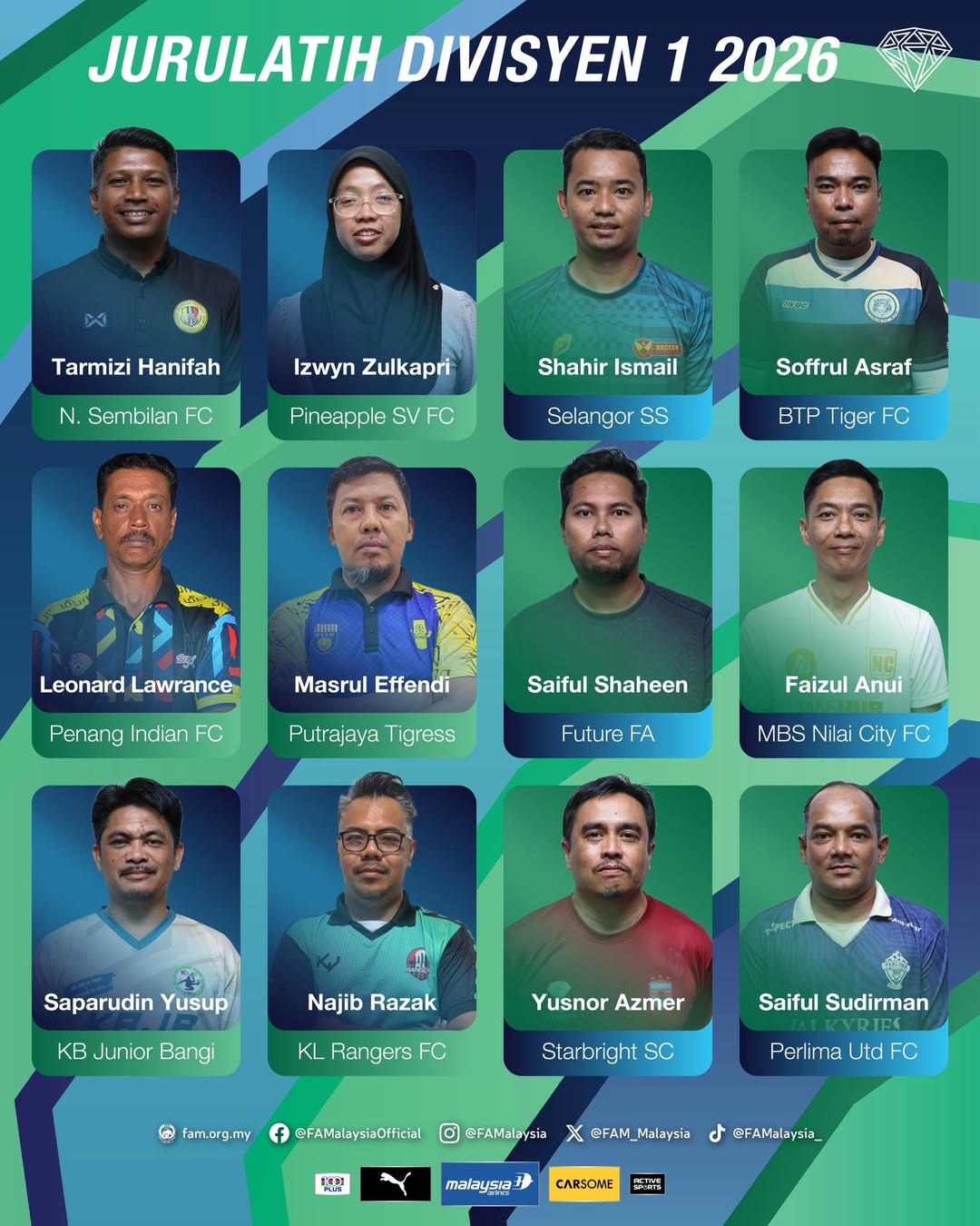 Sebagai persiapan untuk Liga Puteri Divisyen 1 2026, kami dengan bangga mempersembahkan ketua jurulatih bagi 12 pasukan yang akan bersaing. Saingan ini akan dimulakan hari ini di Kompleks Sukan PKNS, Kelana Jaya!
