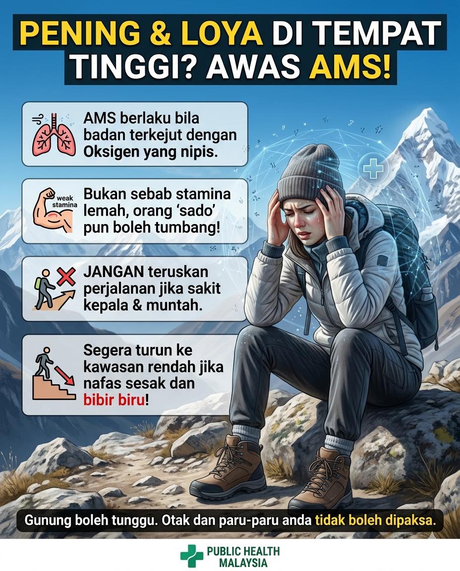 Jika anda baru sahaja berada di kawasan tinggi (ketinggian sekitar 2,500 meter ke atas), ini mungkin petanda tubuh anda mengalami ‘Acute Mountain Sickness’ (AMS).