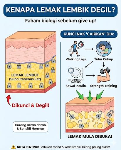 Pernah tak anda rasa geram apabila melihat cermin? Berat badan sudah berkurang, penimbang menunjukkan angka kecil, tetapi bila pegang bawah lengan atau perut bawah, masih ada lapisan lemak lembik yang boleh dicubit?