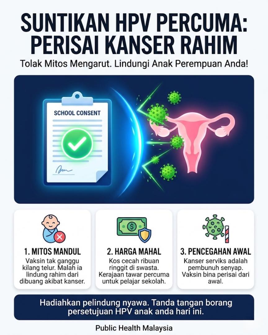 3. Tiada Kaitan Dengan Mandul: Ini adalah mitos paling besar dalam bidang perubatan. Vaksin ini berfungsi untuk merangsang antibodi tubuh melawan virus HPV dan tidak menjejaskan rahim atau ovari anak anda. Sebaliknya, ia melindungi rahim mereka daripada bahaya kanser di masa hadapan!