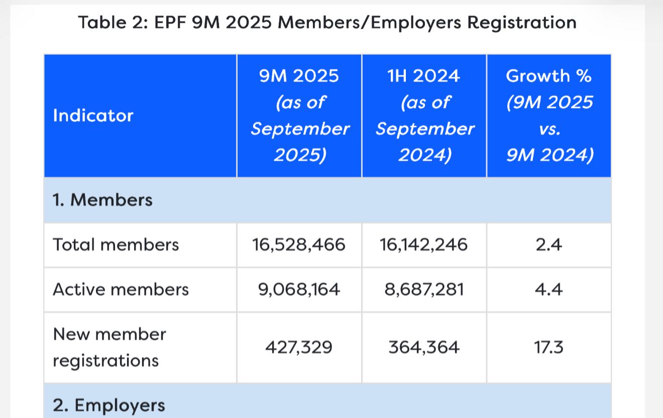 Dalam sembilan bulan pertama tahun 2025, KWSP telah menerima 427,329 ahli baru, menjadikan jumlah keseluruhan lebih dari 16.5 juta ahli. Dari jumlah tersebut, 9.07 juta adalah ahli aktif, menunjukkan bahawa lebih daripada separuh tenaga kerja Malaysia sedang menyumbang kepada caruman.