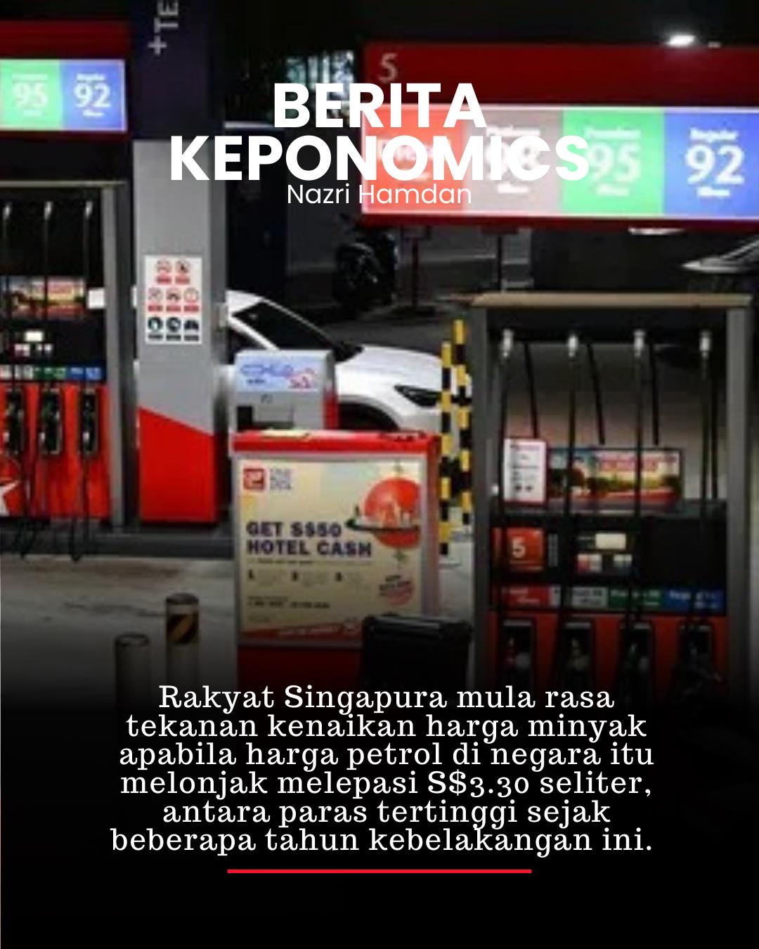 Laporan dari stesen minyak menunjukkan harga petrol RON95 kini berada dalam lingkungan S$3.35 hingga S$3.40 seliter, manakala RON98 telah meningkat kepada S$3.55 hingga S$3.66 seliter.