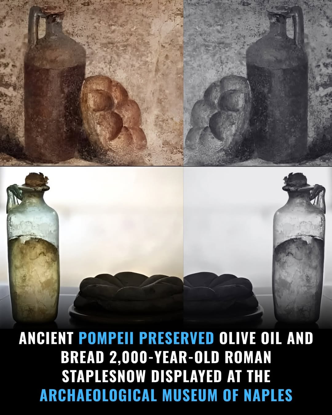 Antara tinggalan menarik yang ditemui daripada runtuhan Pompeii ialah dua contoh yang diawet dengan baik mengenai kehidupan harian masyarakat Rom purba, iaitu sebuah botol yang mengandungi minyak zaitun yang telah mengeras dan sebiji roti yang terbakar.