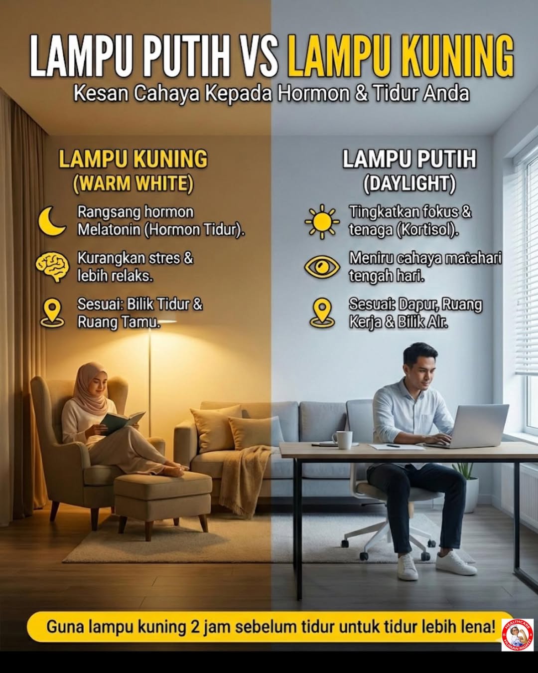 Bagi memudahkan anda, ingat satu prinsip: malam untuk ketenangan, siang untuk fokus. Gantikan lampu di bilik tidur dengan lampu kuning atau warm. Simpan lampu putih untuk ruang kerja. Tidur yang berkualiti bukanlah satu kemewahan.