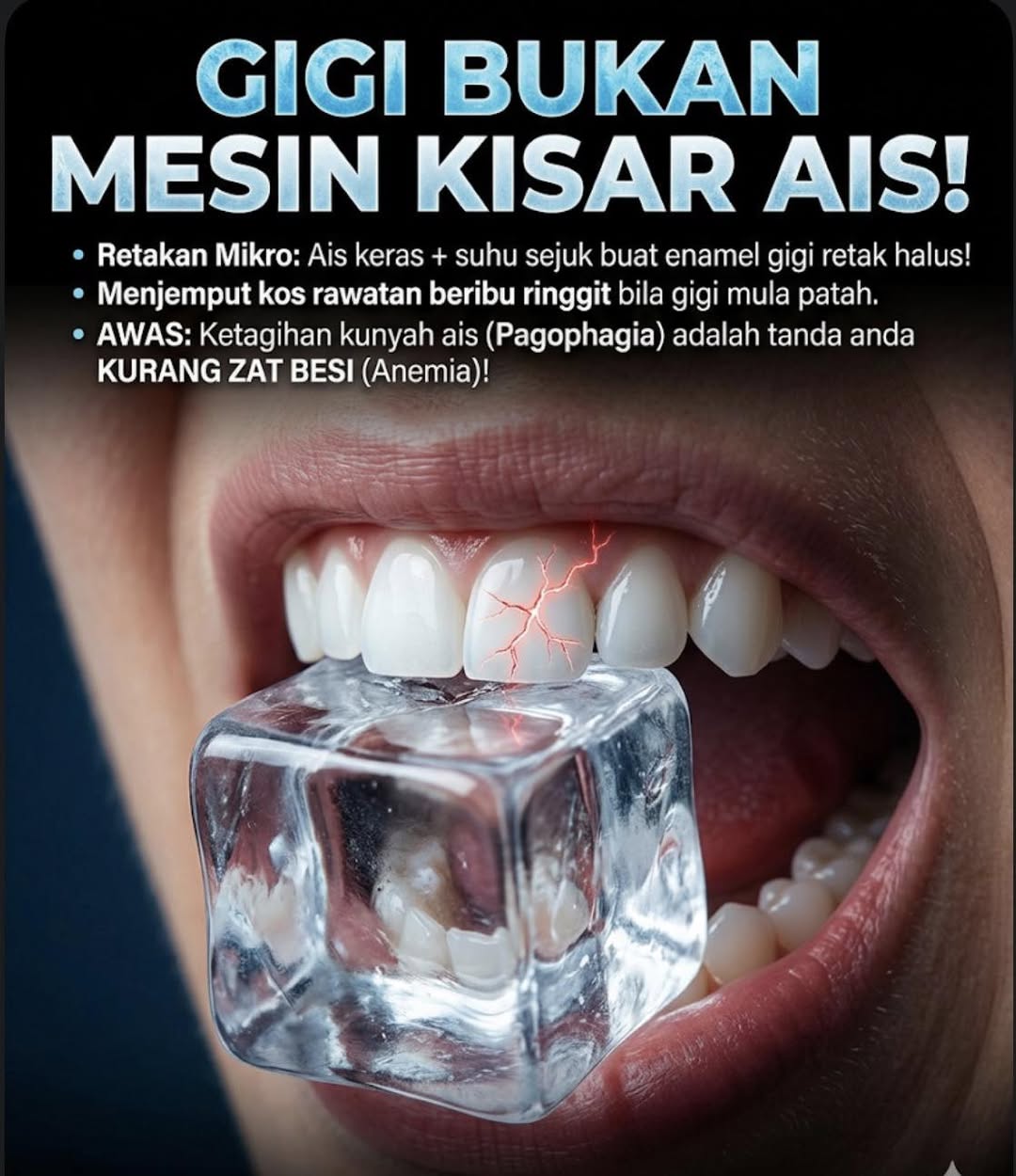 Walaupun nampak remeh, sebenarnya gigi manusia TIDAK direka untuk memecahkan ais setebal itu!