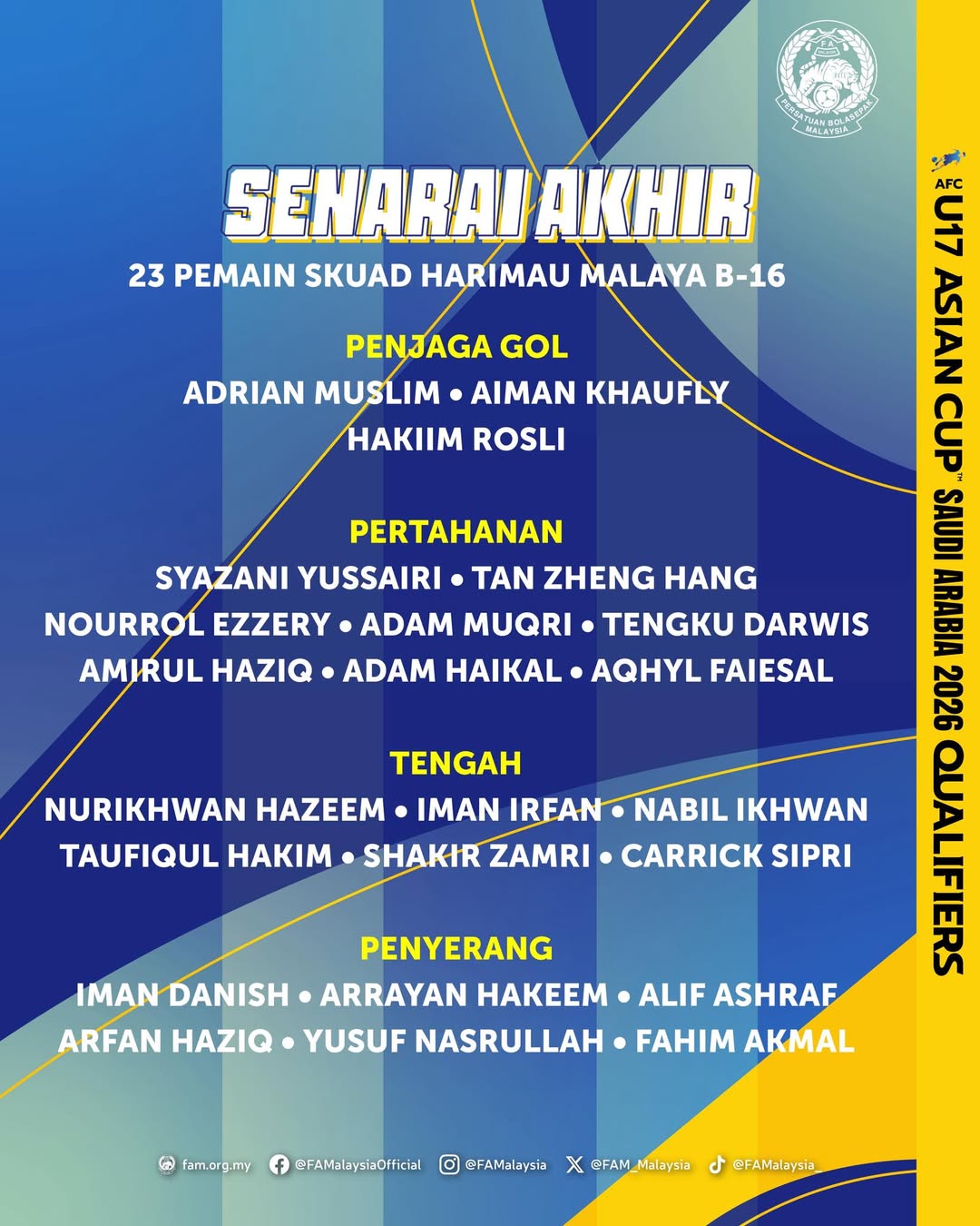 Senarai 23 Pemain Akhir Harimau Malaya B-16 Untuk Kelayakan Piala Asia B-17 2026