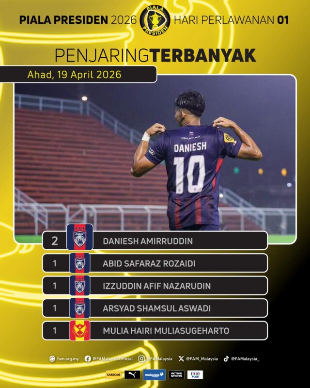 Home Sukan Senarai Penjaring Terbanyak Piala Presiden 2026: Siapa yang Mendahului? Sukan Senarai Penjaring Terbanyak Piala Presiden 2026: Siapa yang Mendahului? By admin - April 21, 2026 2 0 FacebookTwitterPinterestWhatsApp Senarai Penjaring Tertinggi Piala Presiden 2026 🎯 Penyerang dari Johor Darul Ta’zim III, Muhammad Daniesh Bin Amirrudin kini berada di puncak carta penjaring terbanyak selepas Perlawanan 1, dengan mencetak 2 gol! FAM #HarimauMalaya #PialaPresiden2026 Source