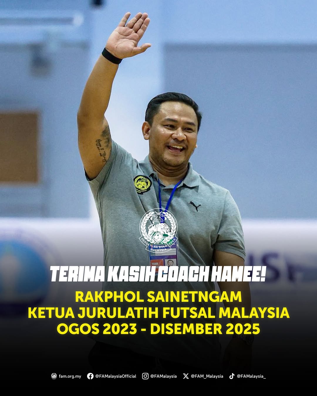 Persatuan Bolasepak Malaysia (FAM) ingin memaklumkan bahawa pada hari ini, 31 Disember 2025, adalah hari terakhir Rakphol Sainetngam, jurulatih dari Thailand, berkhidmat sebagai ketua jurulatih pasukan futsal kebangsaan. Beliau memegang jawatan ini selama lebih dua tahun, sejak Ogos 2023.