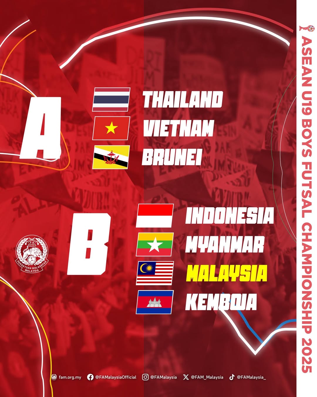 Pada majlis undian yang berlangsung sebentar tadi, pasukan futsal Harimau Malaya B-19 telah diundi ke Kumpulan B bersama Indonesia, Myanmar, dan Kemboja untuk Kejuaraan Futsal B-19 ASEAN 2025. Acara tersebut akan diadakan di Nonthaburi, Thailand, dari 23 hingga 29 Disember 2025.