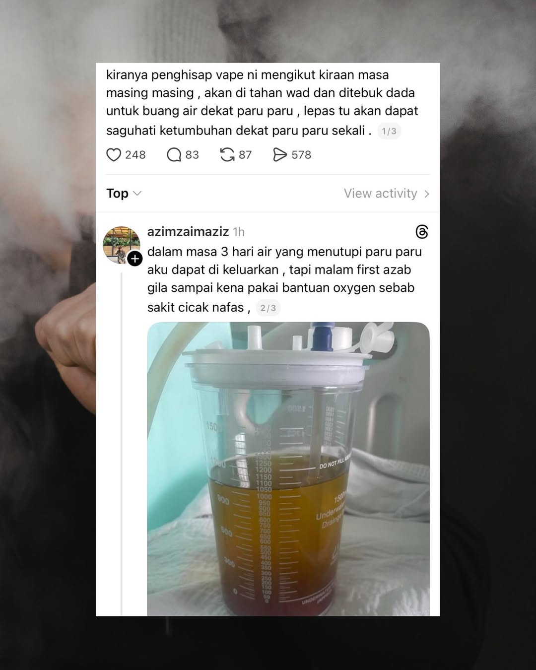 Apabila petugas kesihatan menyatakan bahaya vape, masih ramai yang beranggapan kami hanya cuba menakut-nakutkan mereka. Namun, apabila individu yang terjejas mulai berkongsi pengalaman dengan gambar cecair dari paru-paru mereka dan pengalaman masuk hospital, penggunaan oksigen, serta kesukaran bernafas hingga tidak dapat tidur, mungkin mesej itu akan lebih berkesan.